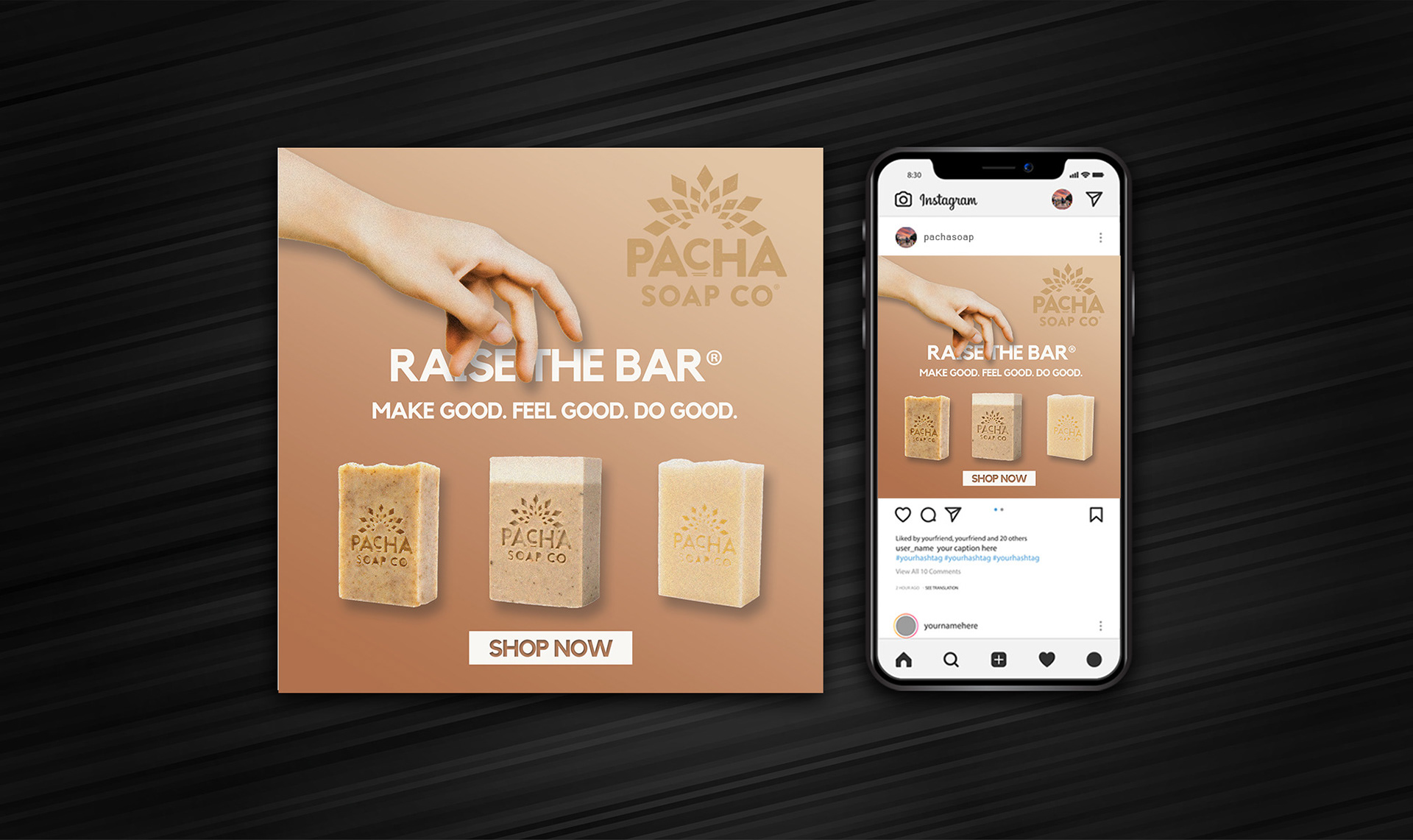 For this project, I developed a clean and modern visual extension for Pacha Soap Co., focusing on natural tones, minimal layouts, and an elevated brand presence. The design direction highlights the company’s emphasis on wellness, sustainability, and handcrafted quality through warm, earthy color palettes and soft product-focused imagery.